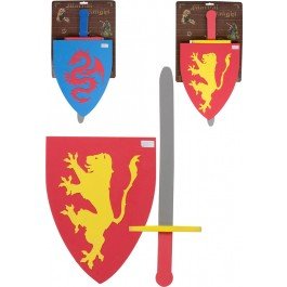, Foam knight sword & shield in assorted colors and designs. Includes 20" sword and 10"x14" shield. Packaged on 11"x13.5" card. Designs and colors will vary